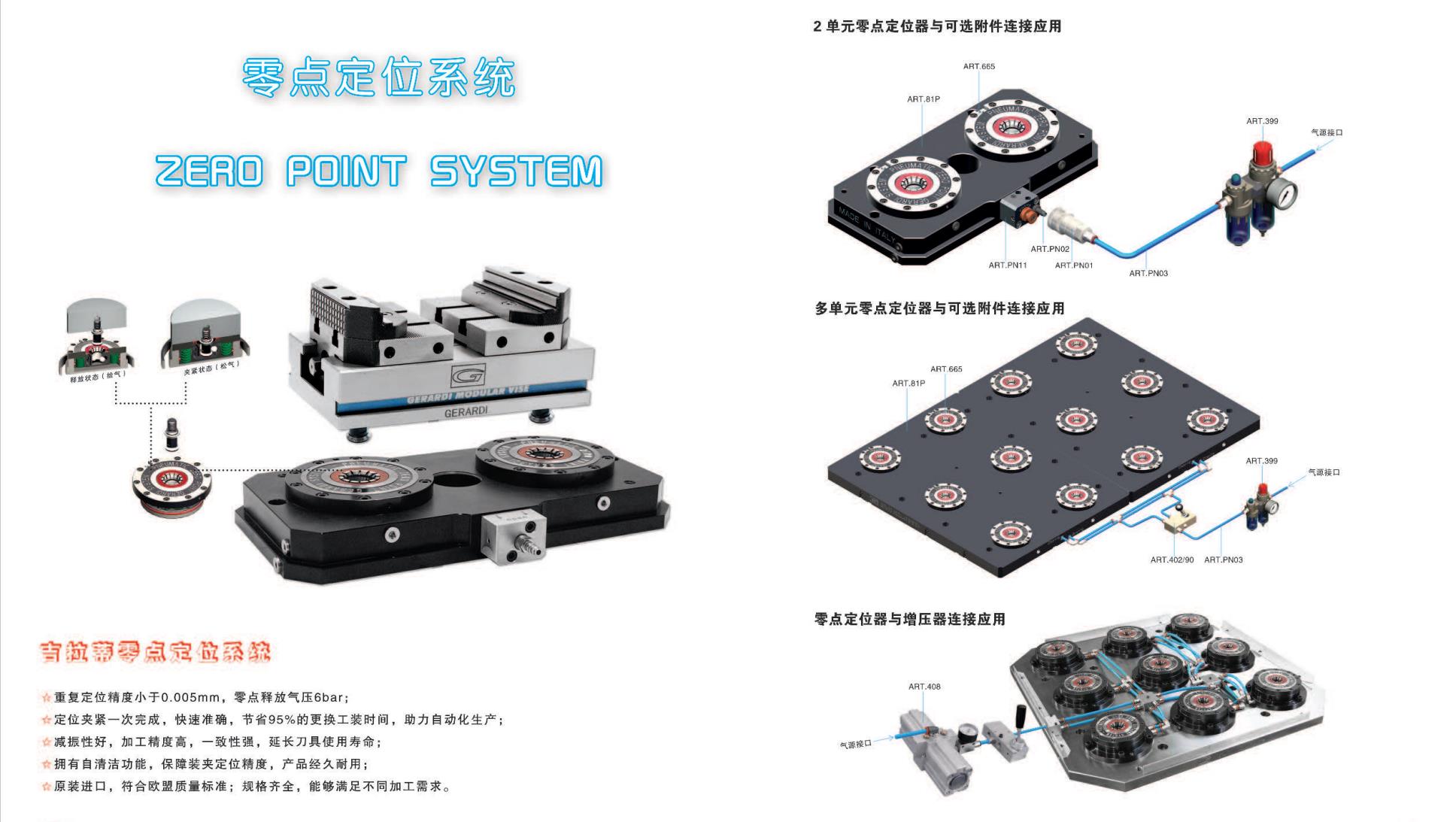 零點(diǎn)定位系統(tǒng)分為手動(dòng),氣動(dòng)和液壓類型。其中,氣動(dòng)零點(diǎn)定位系統(tǒng)廣為普及。通氣,零點(diǎn)卡盤打開(kāi),實(shí)現(xiàn)零點(diǎn)卡盤與拉釘之間的對(duì)接或移除動(dòng)作; 斷氣,零點(diǎn)卡盤鎖緊,實(shí)現(xiàn)零點(diǎn)卡盤對(duì)拉釘?shù)亩ㄎ缓玩i緊動(dòng)作。工件或工裝在機(jī)床工作臺(tái)上的定位和鎖緊一步完成,整個(gè)過(guò)程僅需幾秒。借助機(jī)外預(yù)調(diào)臺(tái),零點(diǎn)定位系統(tǒng)可實(shí)現(xiàn)零件的機(jī)外裝夾,減少90%的停機(jī)時(shí)間,大幅度的提高機(jī)床加工效率。零點(diǎn)定位系統(tǒng)配套機(jī)器人技術(shù),可實(shí)現(xiàn)零件的自動(dòng)化生產(chǎn)。